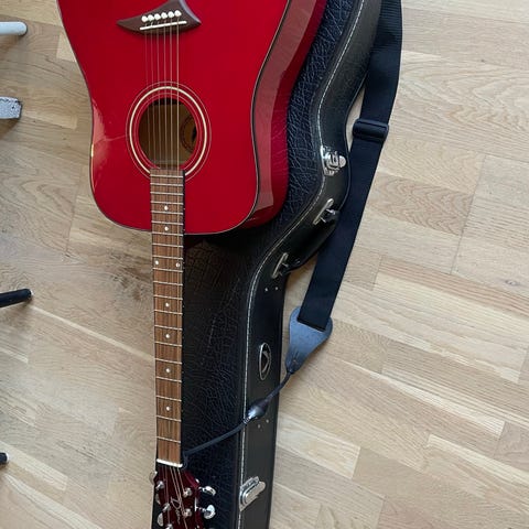 Harmony Akustisk guitar med sunburst finish. Guitaren har en hul krop med F-formede lydhuller, træhals og stemmeskruer med hvide knapper. Velegnet til akustisk musik og øvelser.