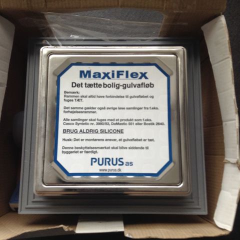 Purus gulvafløbssæt bestående af forskellige komponenter i gråt og hvidt plastmateriale. Sættet indeholder blandt andet rammer, rist og tilslutningsdele, som kan anvendes til installation i gulve for effektiv afvanding. Vådrum.