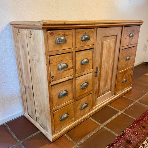 ♻️ En af de helt gamle ♻️ Kæmpe lækker købmandsdisk, med fede detaljer der gør den super unik.. perfekt uperfekt .. jeg er vild med den. Den har en træ pind på bagsiden nederst som “bør” skiftes, dog ikke nødvendigt for brugen og den ses ikke. Mål L160 D54 H 79 pris 3800kr
