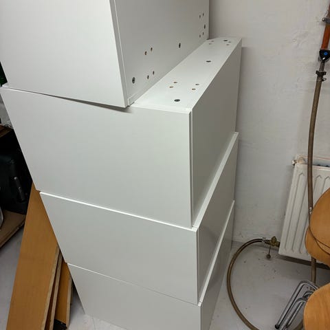 Bemærk at jeg nederst (bag skuffen) fik lavet huller, da jeg to elementet ned fra væggen - jeg var ikke opmærksom på, at der var skruet uautoriserede skruer i for at optimere stabiliteten. Se billede 2 og 3.