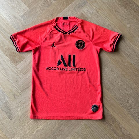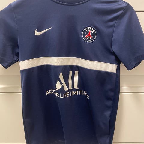 Nike Paris Saint-Germain fodboldtrøje i størrelse 146. Trøjen er blå med røde og hvide detaljer og har tryk med navnet Mbappé og nummer 7 på ryggen. Original trøje og købt på PSG stadion Parc Des Princes - polyester - har nogle hvide streger forneden på højre side (se billede) dog uden betydning - mærket Ligue 1 sidder lidt løs men også uden betydning - brugt men i god og funktionel stand.