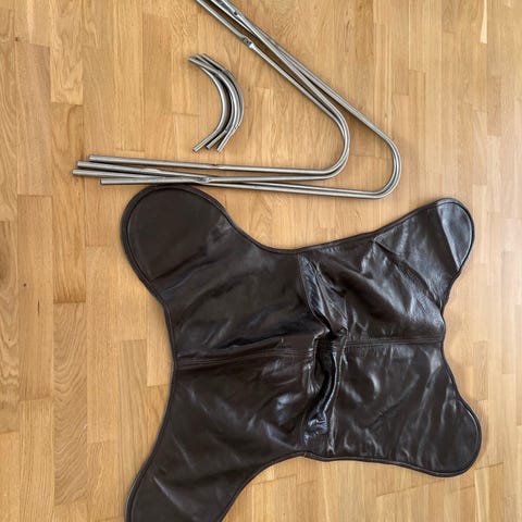 Skæve sædet er lavet af ægte skind og stellet af metal.