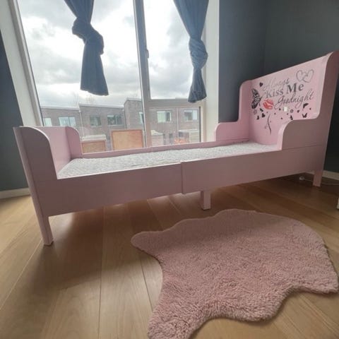 IKEA juniorseng i lyserød farve. Sengen er designet til børn og passer til juniorstørrelse madrasser. Den har en enkel og funktionel konstruktion, egnet til børneværelser.