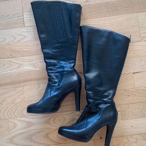 Sælger et par højskaftet støvle med en spids snude. Hele støvlen er i imiteret ruskind, perfekt til både hverdag og fest.