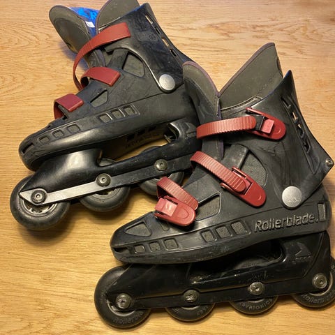 Rollerblade TF herre rulleskøjter med hvid, rød og sort farve str. 42. Rulleskøjterne har et justerbart spænde og snørebånd for god pasform samt velcro strap (ligesom skistøvler).