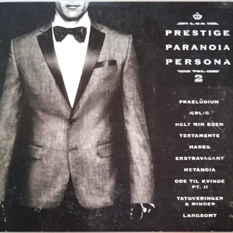 Prestige Paranoia Persona vinylplade med numrene 'Martyrium', '59MD', 'Ode til kvinde', 'Noget dumt', 'Under nul', 'Jeg er Judas', 'Skyd mig ned', og 'Jeg et lag'. Pladen er nummereret 599 ud af 975.