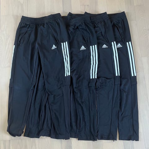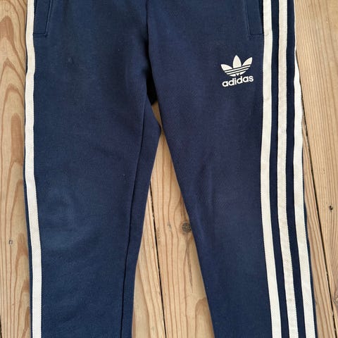 Flotte sorte Adidas bukser med guld striber. Str 104. Pæn stand uden huller og pletter.