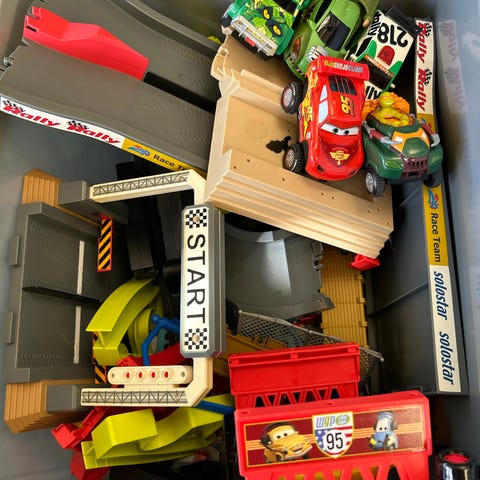 En kasse fyldt med Flexi Trax og flere biler inkl.