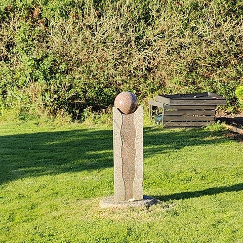 Ukendt dekorativ havefigur formet som en snoet kegle, fremstillet i granit Figuren har en naturlig beige farve og er velegnet til udendørs brug som havepynt eller dekoration.unik skulptur fremstillet af mig ca.60cm.høj ca.40kg flere andre haves?