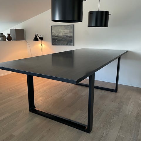 Bordet er passet og vedligeholdt (ingen børn eller dyr i hjemmet) og står uden tydelige mærker eller ridser. Med den tynde nærmest svævende bordplade på blot 2,4 cm er bordet særdeles velegnet til stole med armlæn.