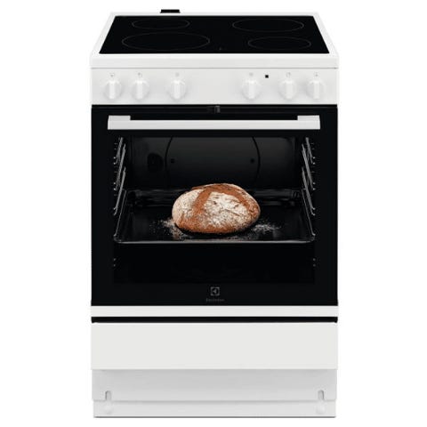 Electrolux komfur EKC6051FOW med glaskeramisk kogeplade og en ovn med 72 liters kapacitet. Lågen har mange smarte innovationer, som gør madlavningen lettere. Glasset forbliver køligt at røre ved, selv når ovnen er på fuld temperatur, så du ikke behøver at bekymre dig om, at nogen brænder sig. Den glaskeramiske kogeplade er meget nem at rengøre, da overfladen er helt glat. Kogepladen er udstyret med restvarmeindikatorer, som angiver, hvilke kogezoner der stadig er varme, efter at de er blevet slukket.