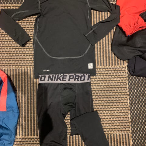 Nike Pro Combat hyperwarm baselayer til børn i størrelse L. Ifølge oversigt fra Nike svarer dette til 147-158cm. Sættet består af en langærmet overdel og lange underdele i blå med gule detaljer. Designet til fodbold og andre sportsaktiviteter, lavet af materialer der sikrer komfort og bevægelsesfrihed under træning og kamp. Kan også bruges som ski undertøj.