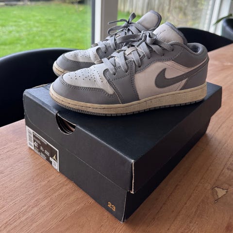Nike Air Jordan børnesko i størrelse 35,5. Skoene er designet til drenge og har en kombination af sort og olivengrøn farve. Materialet er en blanding af læder og tekstil, som giver holdbarhed og komfort. Skoene har en gummisål for godt greb og støtte.