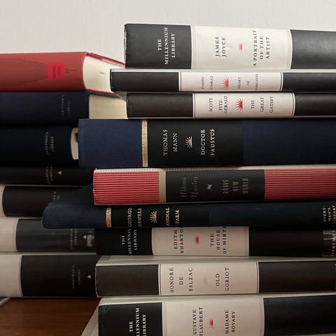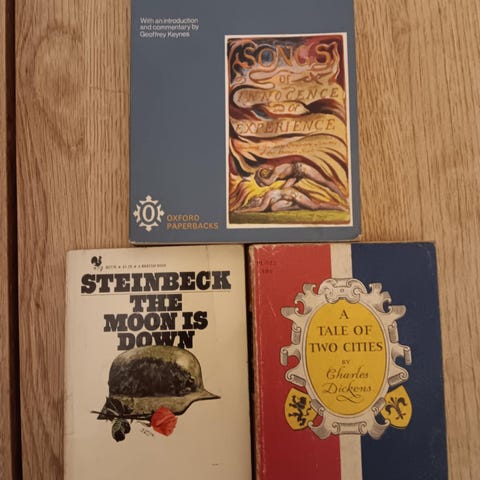 Ca. 55 bøger på engelsk, inkl. Dickens, Huxley og Hemingway, samt Graham Greene, Toni Morrison og William Golding. Bøgerne omfatter forskellige genrer og emner. De er i forskellige størrelser og farver. Bøgerne er trykt i forskellige materialer og udgaver.