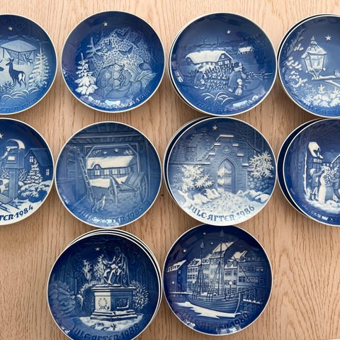 Juleplatter: 1960, 61 125kr, 1973,74,78 50kr, 1980, 81, 86 75kr, 1988, 91 200kr pr stk