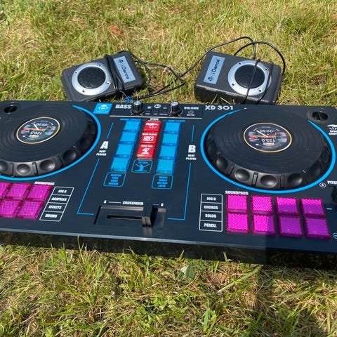 Hercules DJControl Inpulse 200 DJ-controller med to jog-hjul, flere kontrolknapper og tilslutningsmuligheder. Enheden har en kompakt størrelse og er velegnet til begyndere og hobby-DJ's.
