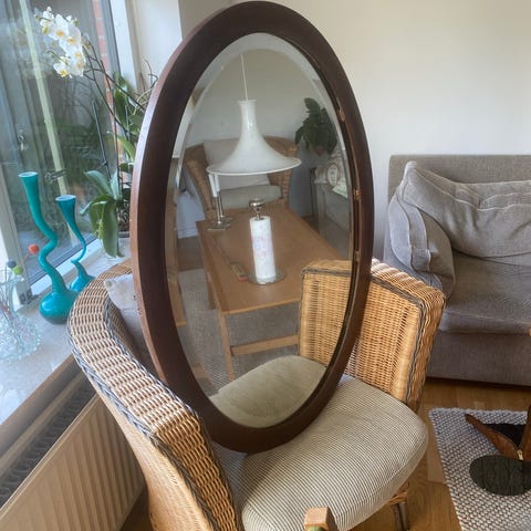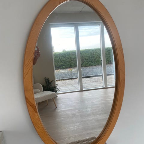 Spejlet måler 48 cm i højde og 58 cm i bredden. Rammen er 5 cm - dvs spejlets ydre mål er 58 cm høj og 68 cm bred.