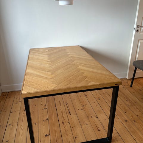 Spisebord med unikt sildebensparket mønster.