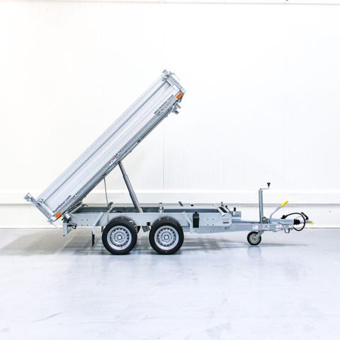 Kraftig alutrailer med en totalvægt på 1800 kg og el-tip.Denne tiptrailer er en del af Humbaurs kraftige HTK serie, med 3-vejs eltip. Bunden er en valset stålbund (uden samlinger) og derefter varmgalvaniseret. En meget kraftig kvalitet med surringsringe i hvert hjørne. Understellet er med kraftige varmgalvaniseret, massive langsgående- og tværvanger. En stordimensioneret 4 trins kip cylinder løfter hele ladet med fuldt læs på.Modellerne er med elektronisk pumpe som standard, hvortil der medfølger et batteri, der har en kapacitet på mellem 25-50 tip. Under vangerne på ladet, sidder der 4 Kip lejer, et i hvert hjørne monteret med kunststofdæmpning der mindsker støj ved kørsel. 2 vedligeholdelsesfrie støddæmpende gummifjeder aksler er direkte påskruet understellet.De dobbeltsidet elektrolytiske oxiderede aluminiums sider kan alle åbnes og er aftagelige. Siderne åbnes med massive vinkelluknings greb, hvor der er valgbar top- eller bundåbning af bagklap med forhøjede hjørnekroge, der øger gennemgangen ved aflæsning. Alle hjørnestolper er aftagelige, således kan man få helt fladt lad. Sliskemagasin er standard, hvor der som ekstraudstyr kan tilkøbes slisker. Bagtil sidder der en massiv kofanger med integrerbare belysningsenheder. Standardudstyr er for- og bagskærme i genanvendeligt kunststof materialeDer er påløbsbremse med bakningsautomatik der lempeliggør bakning opad med læs. Fortil sidder kuglekoblingen der har sikkerhedsmarkering for fastmontage. Til lys og ladestrøm sidder der et 13 polet stik. Tip traileren er monteret med 13” eller 14” kvalitets dæk, der giver en læssehøjde på 70 til 73 cm.3 Vejs tip, med EL & Nødpumpe, ved hjælp af 4 trins hårdforkromet hydraulikcylinderKabel betjening med 3,5 Mtr. ledning, så du kan stå ved siden af trailer og observere godset, mens den tippesLadestik indbygget i forvangeIndbygget baklys i baglygteBagsmæk hængslet i top og bund