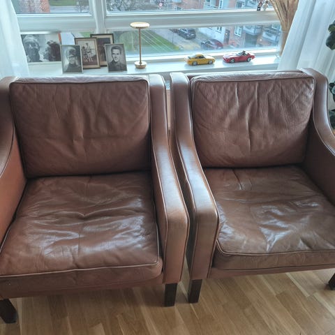2 Opus designstole i nøddetræ og læder sælges samlet.