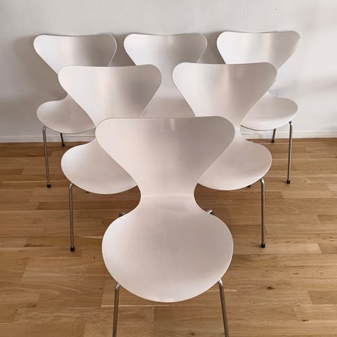 6 7er stole af Arne Jacobsen. Stolene er brugte og standen som ses på billederne. Alle er hårde i ryggen.