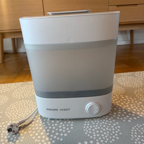 Philips Avent sterilisator til flasker og tilbehør i hvid og lyseblå farve. Designet til at sterilisere babyflasker og tilbehør ved hjælp af damp. Indeholder et rum til flere flasker og tilbehør. Strømkabel tilsluttes til almindeligt strømstik.