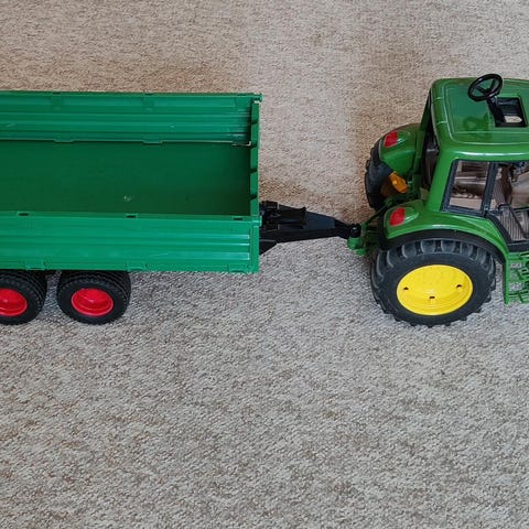 John Deere traktor med vogn og plastik kævler og andre træ ruller baglygte på traktor mangler der er et rat oven i styrehuset hvor man kan styre traktoren ovenfra.