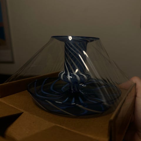 Hay kubelysestager lavet af farvet glas. Sættet indeholder to stager i forskellige størrelser og farver, designet til at holde kubelys. Passer til dekorative formål i hjemmet.