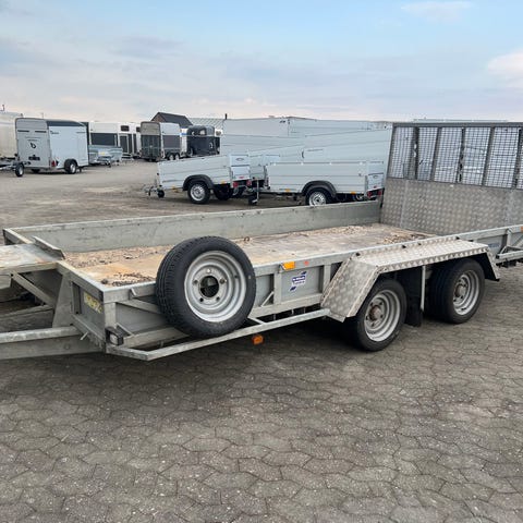 Brugt maskintrailer fra Ifor Williams med høj bagrampe og støtteben.