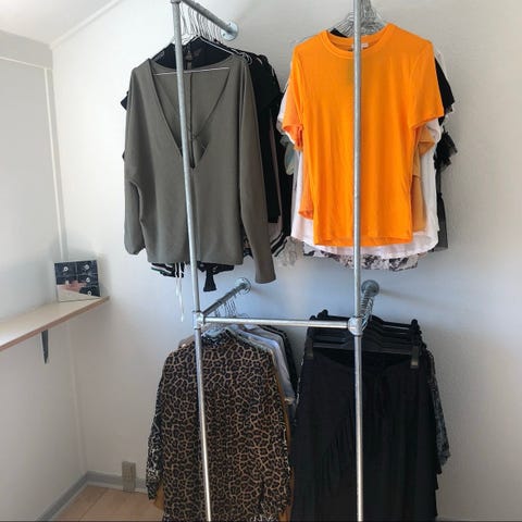 Fordele ved tøjstativ i stålGiv din entré eller soveværelse et ryddeligt og stilrent udtryk med dette tøjstativ i industrielt design. Den lange bøjlestang giver plads til jakker, skjorter og bukser, mens de to hylder rummer sko, tasker og opbevaringskasser. På siderne kan du hænge hatte, tørklæder og paraplyer på de medfølgende 6 S‑kroge. Det rustikke brune trælook kombineret med sort stål fremhæver dit tøj og holder det lige ved hånden.Robust og praktisk garderobeløsningRammen er lavet af stål og holdbar spånplade, så stativet står stabilt i hverdagen. Topstangen har en statisk bæreevne på 30 kg, hver hylde kan bære op til 70 kg, og hver krog op til 5 kg (samlet maks. 200 kg). Tøjstativet leveres med nummererede dele og enkle instruktioner, så du hurtigt kan komme i gang - ideelt som åben garderobe, i gæsteværelset eller på altanen til lufttørring.Åben garderobe med topstang, 2 hylder og 6 S‑krogeStærk stålramme og holdbar spånplade – samlet maks. 200 kgIndustrielt look i rustik brun og sort, der passer i moderne hjemNemme, nummererede dele for hurtig monteringPlads til tøj, sko, tasker og accessories ét stedFarve: Rustik brun, sortMateriale: Spånplade, stålStørrelse: 160 × 100 × 45 cm (H × B × D)Vægt: 13,7 kgMaks. statisk belastning, bøjlestang: 30 kgMaks. statisk belastning pr. hylde: 70 kgMaks. statisk belastning pr. krog: 5 kgMaks. statisk samlet belastning, kroge: 30 kgMaks. statisk samlet belastning: 200 kgInkluderer: 1 tøjstativ, 6 S‑kroge, monteringssæt, instruktion