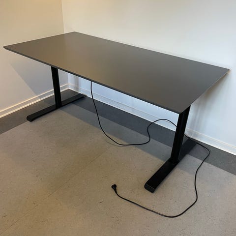 Conset hæve- sænkebord, sort stel og bordplade i sort linoleum. Et par enkelte skrammer på kant af bordplade men ellers perfekt. sælges evt. sammen med skuffekasette.