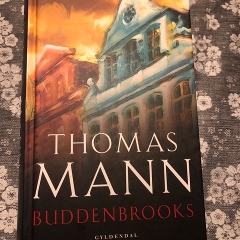 Thomas Mann, Huset Buddenbrook bog med to bind. Bogens omslag har en kombination af rød læderryg og marmorerede forsider. Teksten er på dansk i süper stand