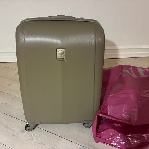 Rød kabinekuffert. Fin stand. Få skræmmer. Alle lynlåse, hjul, mm. fejler intet.