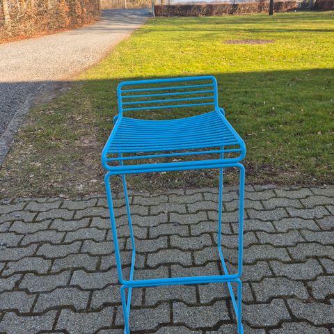 Et par barstole, model Hee, med metalstel i lakeret støvet grøn, produceret af HAY.
