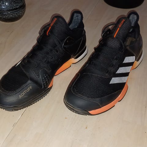 Adidas CourtJam Bounce tennissko i hvid med røde detaljer. Str. 42. Skoene har en slidstærk ydersål med mønster til god greb på banen. Overdelen er lavet i åndbart materiale med polstret ankelområde for komfort. Velegnet til tennis/padelspil og andre sportsaktiviteter.