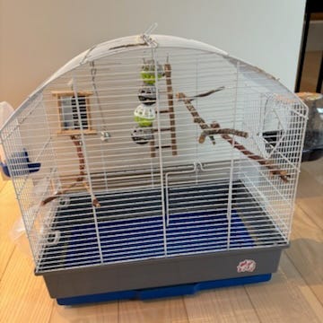 Fuglebur med grøn bund og hvidt metalgitter. Inkluderer flere træpinde og tilbehør til fuglehold.