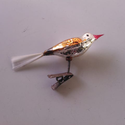 Gl vintage sølv fugl med spidsfugl næb og hvid fjer 15 cm. Julepynt juletræspynt