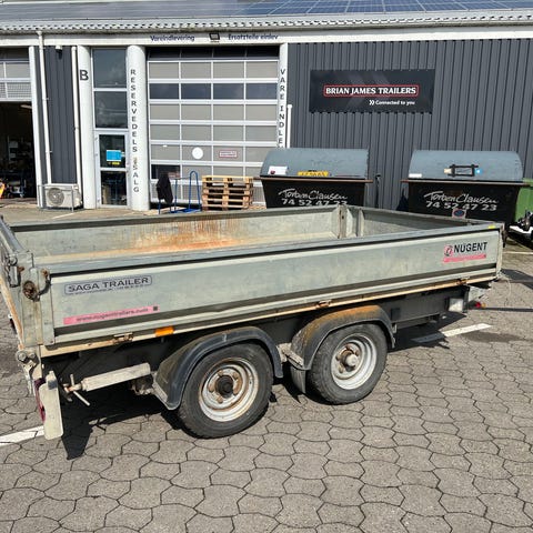 Brugt tiptrailer fra Nugent med eltip, stålsider, stålbund, støtteben og aluramper i magasin.