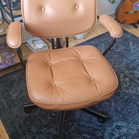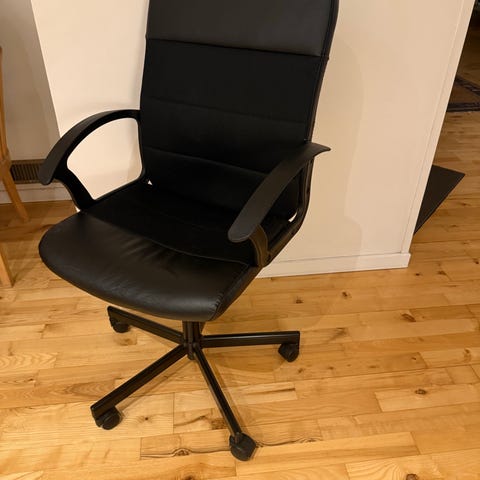IKEA Kontorsstol med polstret sæde og ryg i gråt kunstlæder. Stolen har et quiltet mønster på sæde og ryg, samt hvide armlæn. Bagsiden er beklædt med sort stof og har en lomme.
