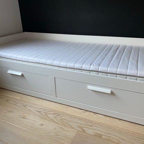 Sovesofa med 2 skuffer. Der medfølger en almindelig madras på 80x200 cm, men det er ikke den originale madras fra Ikea, som kan foldes ud og anvendes til dobbeltseng.