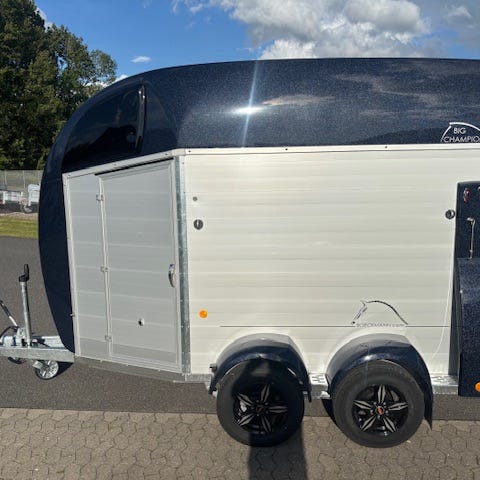 Brugt hestetrailer i glasfiber fra Bücker Careliner med alubund, saddelskab, sparkeplader, sidepuder og panoramavindue.