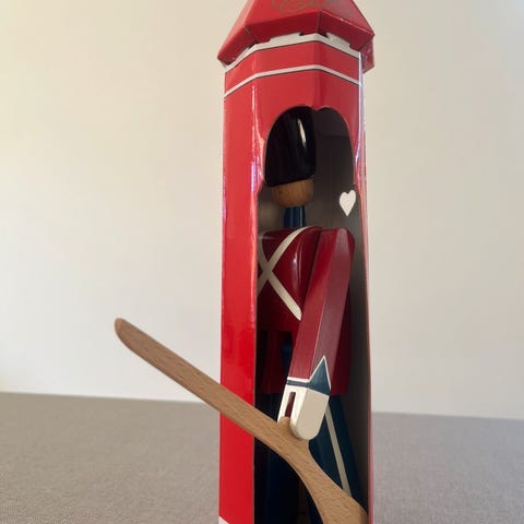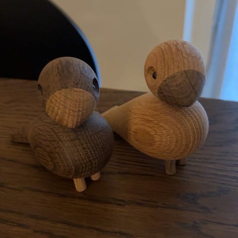 Kay Bojesen Påske Dekorationer bestående af to træfigurer med tilbehør. Den ene figur er en sortklædt mand med hat og stige, den anden er en kvinde med hvid og grå kjole og hat.