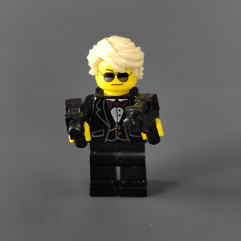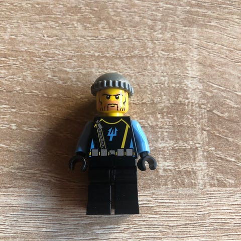 LEGO Banan fra serie 16 minifigur med tilbehør i form af en gul kajak. Figuren har grøn overdel, blå ben og forskellige ansigtsudtryk med solbriller. Kajakken er gul med blå mærker.