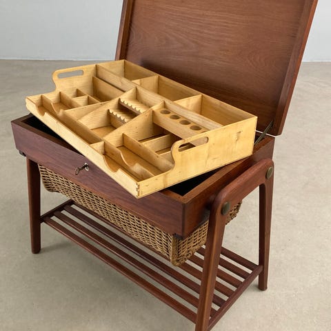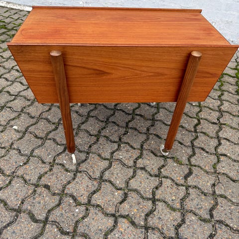 Stort smukt teak sybord i dansk design med skuffer foran og i siden samt kurv nedenunder i virkelig flot stand L73cm x H56cm og dybde 43cm mp 1500kr afhentes i 8570 Trustrup