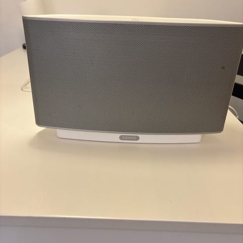 Sonos trådløs højttaler i hvid farve. Enheden har et kompakt design med integrerede kontrolknapper og netledning. Velegnet til trådløs musikafspilning i hjemmet.