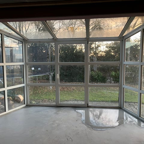 Sidepartierne måler 120 og midterpartiet måler 300 cm. Døren er ca 100.