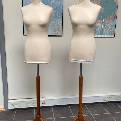 Fin ældre dame gine, udstilling, tøj model på træ fod.