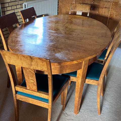 Det er en komplet antik spisestue med en lille skænk, stor skænk , stort dæktøjsskab, bord med udtræk og 12 ens stole. Bordet og stolene er massivt egetræ og de andre er af lidt forskellige træsorter. Det skal helst sælges samlet, men andet kan aftales. Tillægspladerne er ikke egetræ.
