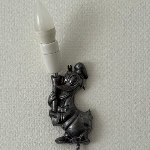 Cool vintage Mickey Mouse lampe i tin fra 1960erne. Den er renoveret med ny porcelænsfatning og stribet stofledning (sort/hvid). Hvis du ønsker det, kan jeg montere den med rød porcelænsfatning og rød/hvid stribet ledning. Jeg har en tilsvarende Anders And lampe til salg. Køber du begge, gives der 200 kr. i rabat. Kan sendes efter aftale.