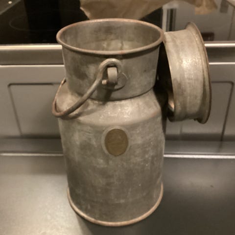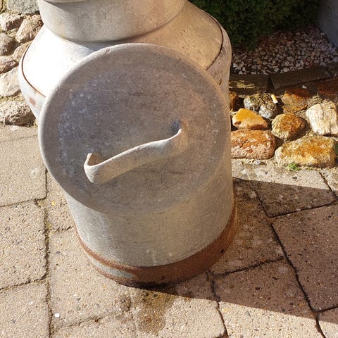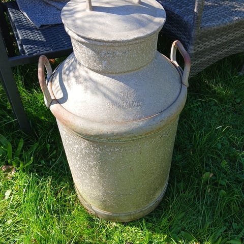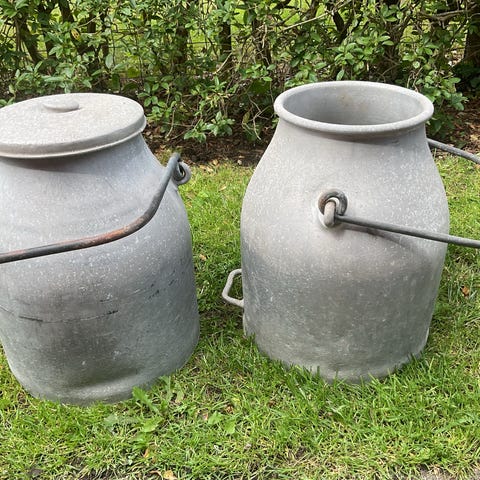 Galvaniserede mælkespande med en kapacitet på 50 liter hver. Fremstillet i metal med låg og håndtag for nem håndtering. Ikke længere velegnet til opbevaring og transport af væsker. Fin til anden brug.
